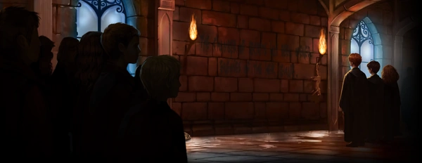 One day, Harry agrees to attend a Deathday Party after Nearly Headless Nick prevents Filch from giving him a detention. However, the party is dreary and they leave early. En route to the Great Hall, Harry hears the strange voice again and follows it even though Ron and Hermione are unable to hear it. It leads them to Mrs Norris who has been Petrified and is hanging near a warning on a wall that the "Chamber of Secrets has been opened. Enemies of the Heir beware". The whole school catches Harry standing by the wall and believe he is responsible. Dumbledore tries to correct everyone.[29] Upon learning about the legend of the Chamber of Secrets[30], he is suspected of being the Heir of Slytherin. Harry, Ron and Hermione believe it is probably Draco. To prove it, Hermione starts brewing a Polyjuice Potion. Harry and Ron helps her find the ingredients she needs.[31]