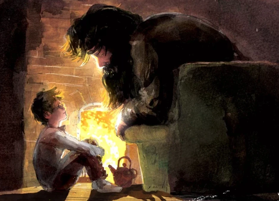 Harry starts getting letters which Vernon and Petunia will not let him have. The sender keeps trying to get letters to Harry, so Vernon taked the family to the Hut-on-the-Rock. Hagrid knocks the door down on Harry's birthday, and tells him the truth about the wizarding world and that he is accepted to Hogwarts School of Witchcraft and Wizardry.[9] They spend the day in Diagon Alley buying school supplies and Hedwig gifts him wity Hedwig.[9]